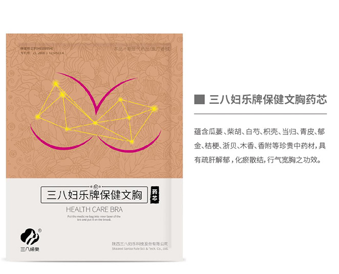 安琢健體內(nèi)衣藥芯是三八婦樂(lè)研發(fā)創(chuàng)新中心聯(lián)袂陜西中醫(yī)大學(xué)專(zhuān)家研制,陜西食品藥品監(jiān)督管理局批準(zhǔn)生產(chǎn),獲國(guó)家發(fā)明專(zhuān)利,藥芯采用24味名貴中草藥精華,由內(nèi)而外全面呵護(hù)女性健康。根據(jù)“內(nèi)病外治、通則不痛”理論使藥物作用于乳腺及腹部穴位,透皮吸收、穴位吸收、經(jīng)絡(luò)傳導(dǎo),呵護(hù)嬌嫩乳房