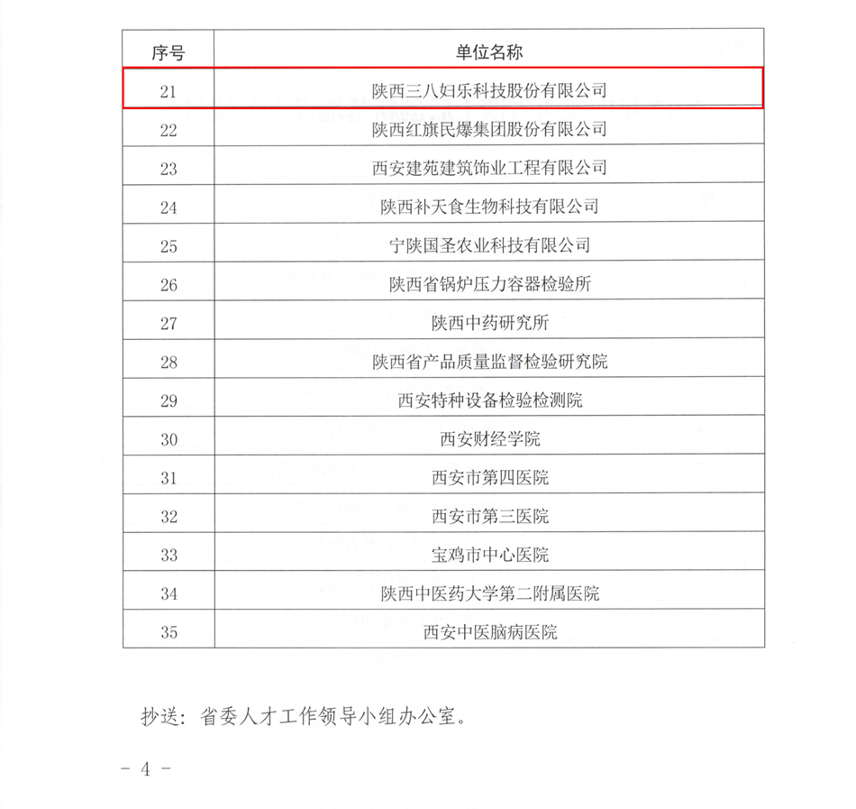 日前,陜西省人力資源和社會保障廳發(fā)布了2017年陜西省博士后創(chuàng)新基地名單,陜西三八婦樂科技股份有限公司成功入選。