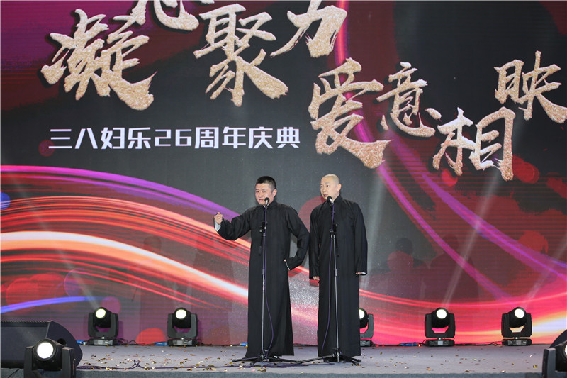 晚會上,來自中國臺灣的著名歌星黃安的傾情獻(xiàn)唱,那些耳熟能詳?shù)慕?jīng)典歌曲,引發(fā)了現(xiàn)場的“千人大合唱”;陜派相聲代表、陜西青曲社著名相聲演員苗阜、王聲也攜手獻(xiàn)演,他們包袱不斷、笑點不停的表演,也讓現(xiàn)場掌聲不斷;晚會還抽取了30位幸運來賓,為他們獻(xiàn)上了三八婦樂26周年的一份大禮。