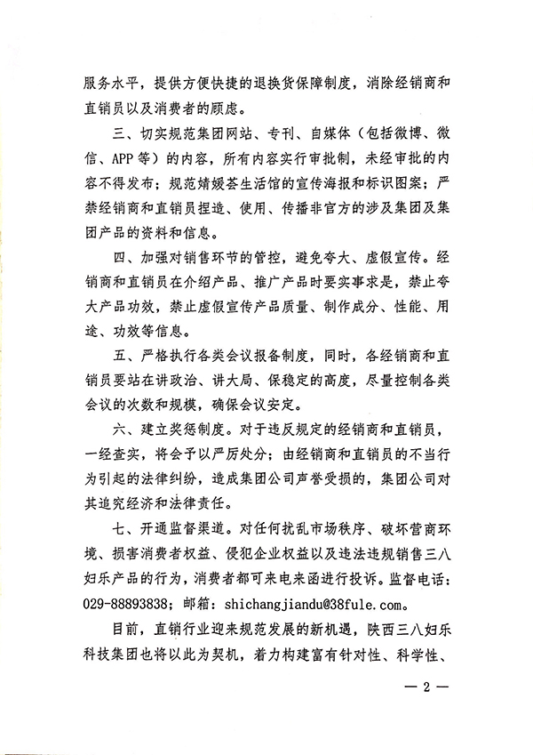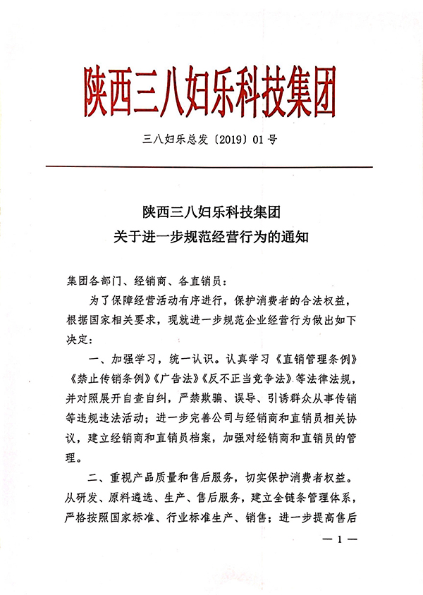 陜西三八婦樂科技集團(tuán)關(guān)于進(jìn)一步規(guī)范經(jīng)營行為的通知