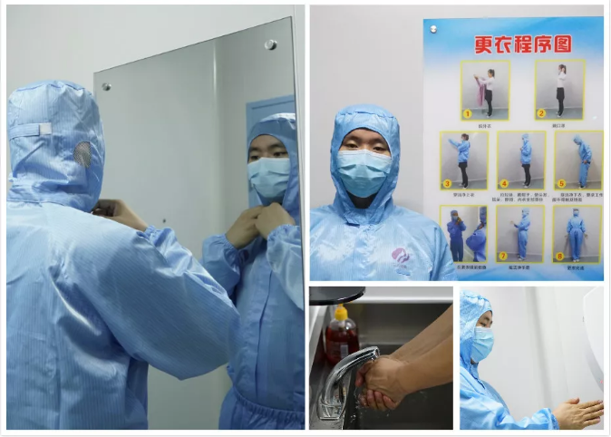 再往里走,在第一間和第二間更衣室中間有一個(gè)隔離間,在這里我們要嚴(yán)格按照七步洗手法清潔自己的雙手,然后進(jìn)行全面的消毒。進(jìn)入第二間更衣室,專(zhuān)業(yè)的工作人員會(huì)給我們指導(dǎo)如何更換無(wú)菌潔凈服。換好全套無(wú)菌服裝之后,我們才能進(jìn)入操作間。車(chē)間的一切生產(chǎn)流程全部與外界隔離,不得不說(shuō)真的是非常的嚴(yán)謹(jǐn),Nice!